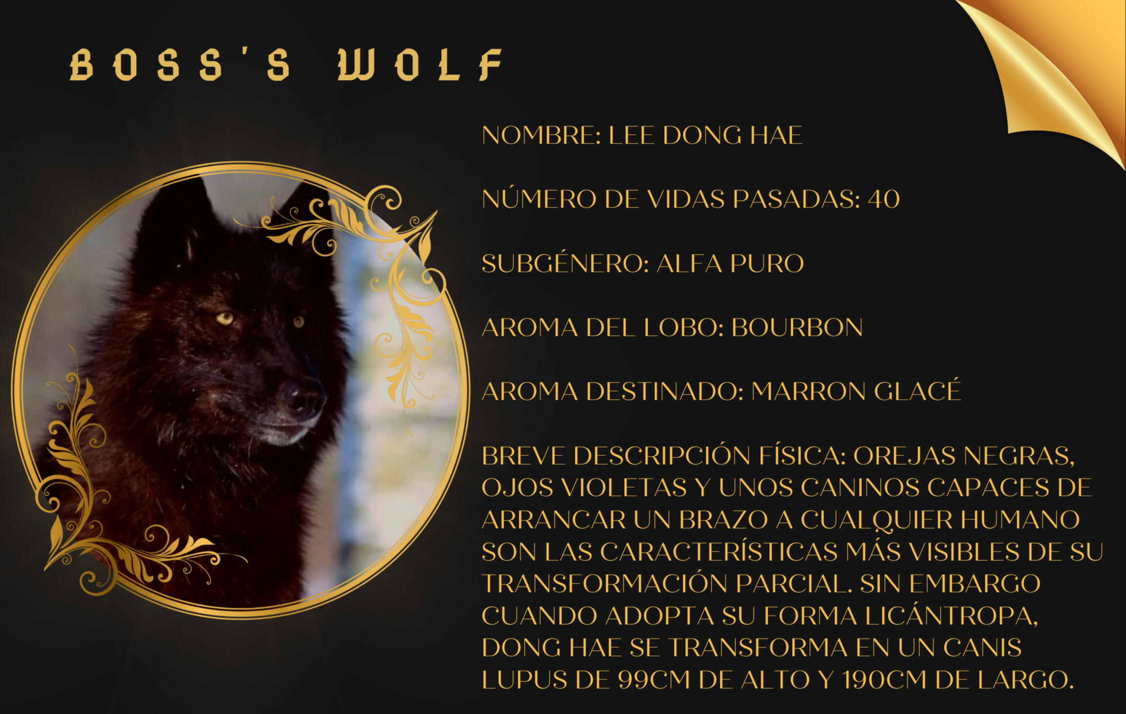 TODOS Y CADA UNO DE LOS DATOS SON OBLIGATORIOS.•El aroma del lobo es el que compaña al lobo en todas sus vidas y es el que aparece en el humano cuando tiene el primer celo. Tiene que aparecer en la ficha de humano y en la del lobo, pero en la del lobo SOLO hay que poner ese, porque es el único que no va a cambiarle nunca.•El aroma de destinado acompaña al lobo en todas sus vidas. Es un aroma que SOLO y ÚNICAMENTE puede oler la pareja destinada de nuestro personaje. Es necesario colocarlo en la ficha del humano y del lobo aunque no se tenga una trama de destinado aún.•En caso de ser gamma se ha de colocar en la ficha el aroma original. También deberá colocarse donde tiene la marca y si es visible o no.•La historia debe explicarnos brevemente sobre el personaje. Contarnos sobre su pasado y sobre él.Ejemplo de ficha en Carrd
