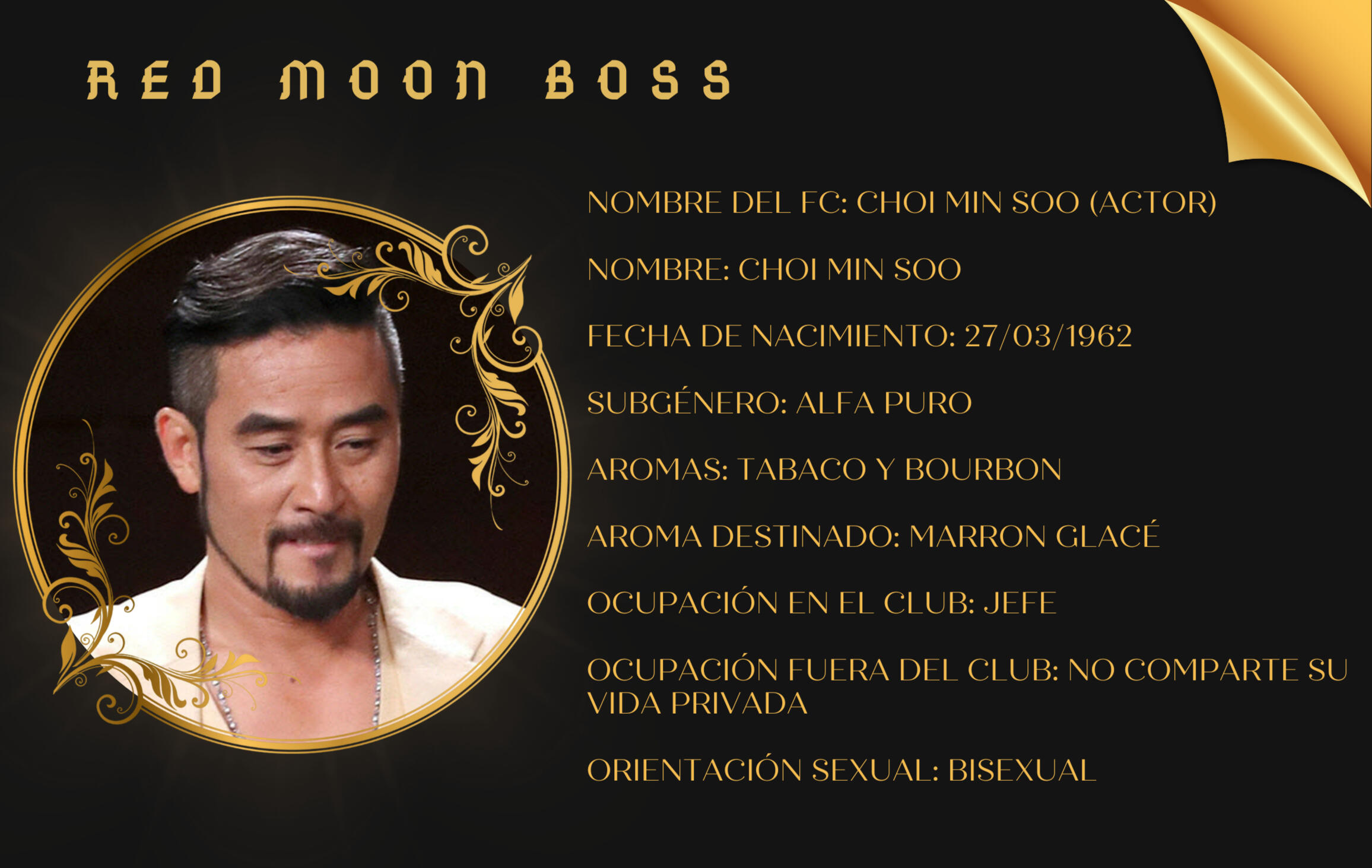 Situado en la mejor zona y en una de las mejores calles de Seúl. El Red Moon Club surgió como sede principal de la Delirium, una de las mafias más bien estructuradas de Corea.¿Su líder? Choi Min Soo, jefe del club... entre muchas otras cosas.La Delirium se vio afectada por multitud de bajas tras el intento de robo del famosísimo diamante Pink Panther. Dada la cantidad de miembros de la corporación que fueron cazados por las autoridades tras el desastre y lo vulnerables que se vieron, el Líder, Choi Min Soo, decidió invertir en un club nocturno donde mantenerse un tanto apartados de la delincuencia hasta que dejaran de estar en el punto de mira de la policía. Claro, siempre que los civiles preguntaran, puesto que la realidad... Era otra distinta.Sin embargo, el jefe nunca pensó que le tomaría tanto cariño a aquel lugar, que seguiría con su segundo trabajo de espaldas a la calle y que de cara al público solo regentaría su pequeño reino, un club con los mejores camareros, artistas y la mejor seguridad. Ofreciéndoles la posibilidad a sus clientes habituales de poder efectuar sus trabajillos entre sus cuatro paredes acompañados de buena música y el mejor ambiente.¿Quieres trabajar aquí? ¿O simplemente estás de paso y quieres tomar algo? Carreras, peleas, familias rotas y felices abandonos e incluso homicidios. Sea cual sea tu vida... Somos un simple club por el día, pero cuando la noche se cierne sobre nosotros y la luna está en su auge de plenitud, el Red Moon Club se convierte en un lugar donde hablar de negocios, tomar una copa, escuchar música en directo o simplemente disfrutar de una grata compañía y darle un descanso a nuestro lobo. Adelante, el Red Moon Club te sorprenderá gratamente.¡Ah, sí! Tengo entendido que ya tienes tu llave. En ese caso... acompáñame, te enseñaré nuestras instalaciones.El club está perfectamente acondicionado, siendo un lugar grande y disponiendo de reservados y habitaciones de primerísima calidad en nuestra segunda planta, todo en un ambiente discreto y lujoso. Bar de copas y en ocasiones especiales, zona de restaurante, donde efectuar una cena de negocios o algo un poco más… íntimo.Durante nuestros espectáculos ofrecemos una amplia gama de bebidas alcohólicas. Contamos con un escenario donde los mejores artistas underground ofrecen fantásticos espectáculos, bailarines que te harán querer quedarte un rato más y nuestros maravillosos camareros siempre atentos a todos y cada uno de nuestros clientes.Nuestro servicio está calificado en cinco estrellas, garantizamos la mejor calidad y diversión para todo tipo de gustos.Si quieres pasar un buen rato, este es tu club, no te arrepentirás de haberte pasado por aquí, pero tampoco dudes en tratar de unirte a nuestra plantilla, la manada cuanto más grande sea, más fuerte se hará.Y recuerda... en Red Moon hacemos todos tus sueños realidad.