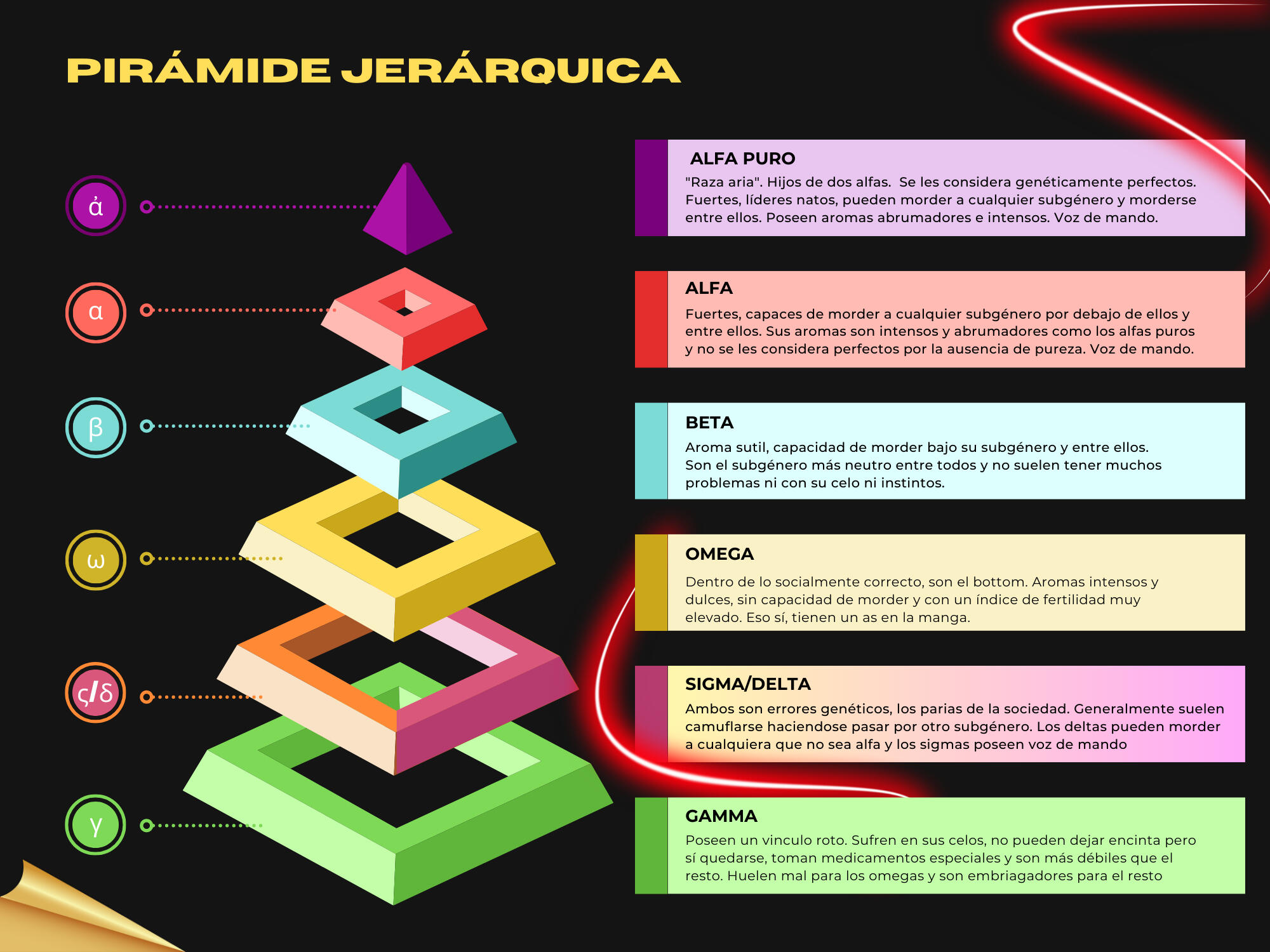 ALFA PURO ἀ—Cuando dos alfas tienen un hijo a su subgénero se le denomina como ALFA PURO.—Estos tienen autoridad sobre TODOS los demás subgéneros, siendo así los más fuertes. Poseen la VOZ DE ALFA, con la que pueden ordenar a los demás subgéneros y estos, innegablemente, tendrán que que obedecerles.—A los 18, junto a la presentación de su lobo, el primer celo y su subgénero, adquieren colmillos con los cuales podrán marcar a otra persona en un futuro si así se desea.—Cuando entran en celo su primer instinto será marcar, claro que no es obligatorio que lo hagan. Necesitan el olor principalmente de un OMEGA para calmarlo. También desprenden feromonas de forma muy fuerte cuando entran en ese estado.—Su aroma suele ser fuerte e invasivo.—Son muy sensibles a las feromonas, ya sean de cualquier subgénero.—Cuando el lobo está en posesión del cuerpo, sus ojos se presentan en el humano de color morado. Este color puede variar en tono y destellos pero siempre será MORADO SOLO CUANDO SE SOMETA A ESTE FENÓMENO.ALFA α—Son muy parecidos a los ALFAS PUROS.—Estos tienen autoridad sobre los otros subgéneros (excluyendo los ALFAS PUROS) Poseen la VOZ DE ALFA, con la que pueden ordenar a los demás subgéneros haciendo que estos tengan que obedecerles. Eso sí, no es recomendable que la usen con un rango superior al suyo, suele molestar bastante a los alfas puros.—A los 18, junto a la presentación de su lobo, el primer celo y su subgénero, adquieren colmillos con los cuales podrán marcar a otra persona en un futuro si así se desea. A los únicos a quienes no podrán marcar es a los Alfas Puros, pues su piel es más fuerte de lo que los colmillos de un alfa normal podrían soportar.—Cuando entran en celo su primer instinto será marcar, claro que no es obligatorio que lo hagan. Necesitan el olor principalmente de un OMEGA para calmarlo. También desprenden feromonas de forma muy fuerte cuando entran en ese estado.—Su aroma también suele ser fuerte e invasivo.—Son muy sensibles a las feromonas, más en singular a las de los OMEGA.—Cuando el lobo está en posesión del cuerpo, sus ojos se presentan en el humano de color rojo. Este color puede variar en tono y destellos pero siempre será ROJO SOLO CUANDO SE SOMETA A ESTE FENÓMENO.DELTA δ—Los delta pueden considerarse un error genético de un alfa puro o un alfa, por ende es muy raro encontrarlos. Por eso mismo suelen ser mal vistos por el resto de subgéneros.—Son socialmente sumisos y de carácter parecido a los omegas. Sin embargo estos son más similares físicamente a los alfas.—A los 18 les salen colmillos con los que pueden marcar a cualquier subgénero excepto a los alfas y alfas puros. También pueden recibir una marca de cualquier subgénero con capacidad de hacer una. A esa edad aparece su lobo y se someten también a su primer celo.—Son hipersensibles, todo les afecta de una forma más intensa. Son también hiper-empáticos, llegando incluso a sentir lo que está sintiendo la otra persona. Suelen ser bastante amigables, nada competitivos y tienen cierta falta de iniciativa.—Su aroma es dulzón, atrayente y embaucador. Sería algo similar al efecto que tiene el aroma de un omega, sin embargo, uno de sus aromas será más parecido a éstos y el otro al de los alfas. Eso sí, sin perder la esencia que ya hemos comentado.— Tienen celos muy fuertes e intensos y pese a que su preferencia general es la de pasarlo con un alfa, no les supone ningún problema pasarlo con cualquier otro subgénero. Tienen un deseo sexual muy alto y segregan mucho lubricante natural. Es muy difícil saciarles en su celo y casi que son incapaces de pasarlo solos, ya que los supresores no suelen hacerles efecto. Dura tanto como el de un alfa, de cinco a seis días por lo general y son tan fértiles como ellos.—Son bastante sumisos. Las voces de mando les afectan casi de inmediato, ya sea de un alfa, alfa puro o de un sigma.—Pueden hacer nidos tanto en el celo como en momentos de necesidad, como si de un omega o gamma se tratase.—Por lo general su olfato está más desarrollado que el resto de subgéneros.—Cuando el lobo está en posesión del cuerpo, sus ojos se presentan en el humano de color melocotón. Este color puede variar en tono y destellos pero siempre será MELOCOTÓN SOLO CUANDO SE SOMETA A ESTE FENÓMENO.OMEGA ω—Cuando un ALFA (tanto puro como normal) usa su VOZ DE ALFA tienden a agachar la cabeza y obedecer.—A los 18 le salen colmillos aunque estos no les sirven para marcar. A esa edad aparece su lobo y se someten también a su primer celo.—Cuando entran en celo su instinto es buscar que otro subgénero les marque, claro que no es obligatorio ser marcado. Necesitan el olor de otro subgénero, generalmente de un ALFA PURO o ALFA para calmarlos. También desprenden feromonas de forma indecente.—Algunos OMEGAS, tanto en su celo como cuando se sienten tristes o afligidos crean algo llamado NIDO. Un nido es un cúmulo de prendas que se hace sobre la cama en el cual se sienten cobijados y resguardados. Cuando el omega cree el nido con las prendas de UNA SOLA PERSONA, no podrá pasar su celo con nadie más, ni estarán conformes con que el dueño de esa ropa lo pase con otra persona, pues su lobo no lo aceptaría, ya que estos son bastante posesivos y territoriales en ese aspecto.—Su aroma suele ser dulce y atrayente.—Son muy sensibles a las feromonas.—En casos excepcionales, como ya se ha mencionado con anterioridad, son los únicos poseedores del MAXMO.—Cuando el lobo está en posesión del cuerpo, sus ojos se presentan en el humano de color oro. Este color puede variar en tono y destellos pero siempre será ORO SOLO CUANDO SE SOMETA A ESTE FENÓMENO.SIGMA ς—Los sigma pueden considerarse un error genético de un omega, por ende es muy raro encontrarlos. Por eso mismo suelen ser mal vistos por el resto de subgéneros.—A los 18 les salen colmillos aunque estos no les sirven 